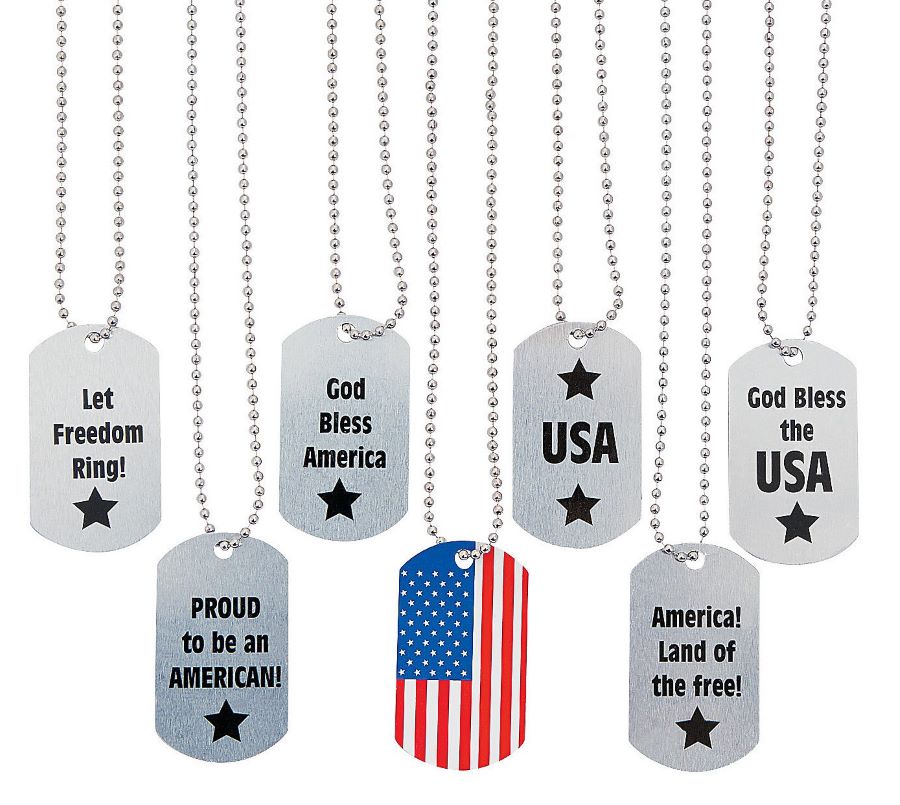 Patriotic Reversible Metal Dog Tag Necklaces on 24″ silvertone chain (2″ tags) $2